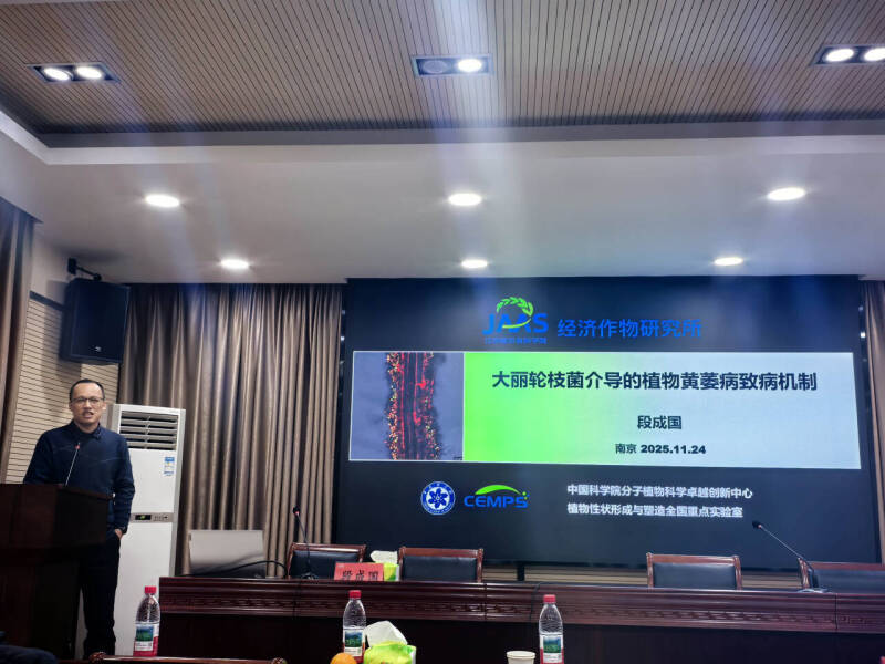 报告会上,段成国研究员作了题为“大丽轮枝菌介导的植物黄萎病致病机制”的学术报告,系统介绍了其团队近年来在植物病原真菌致病与免疫互作领域取得的系列重要进展。报告围绕大丽轮枝菌侵染植物过程中的关键分子机制,重点分享了三方面研究工作:一是揭示了大丽轮枝菌通过胞外囊泡递送效应因子VdEsp1,抑制植物区室化免疫机制的新途径;二是阐明了效应因子VdSSR1通过抑制植物跨界RNAi免疫反应促进病原侵染的分子机制;三是解析了蛋白乙酰化修饰介导的大丽轮枝菌与生防细菌互作机制,为病害绿色防控提供了新的理论依据。相关研究成果为深入理解植物—病原—有益微生物三方互作关系、推动病害防控策略创新具有重要意义。