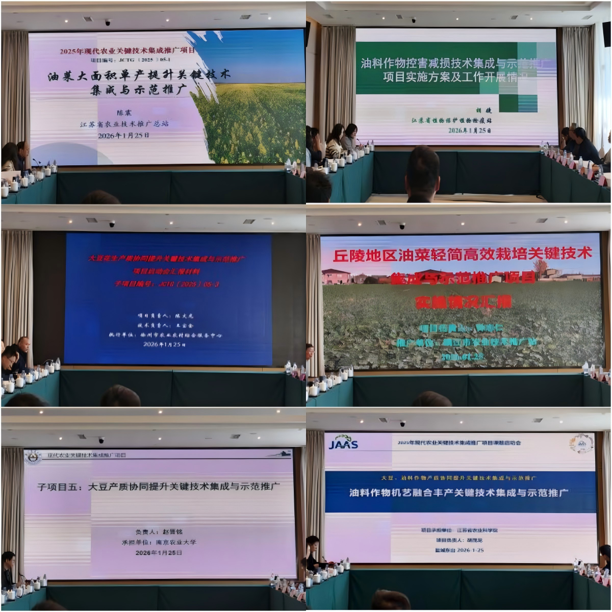 子项目1“油菜大面积单产提升关键技术集成与示范推广”由江苏省农业技术推广总站统筹协调,项目负责人陈震重点汇报了早熟高产耐密品种筛选、耕种管收全程适用农机农艺融合研究进展;子项目2“油料作物控害减损技术集成与示范推广”由江苏省植保植检站统筹协调,负责人胡捷系统介绍了重大病虫害监测预警体系构建与绿色防控技术模式的推广成效;子项目3“大豆花生产质协同提升关键技术集成与示范推广”由徐州市农业农村综合服务中心统筹协调,负责人陈文龙详细阐述了大豆、花生良种、耕、种、管、收大面积单产提升关键技术集成创新及推广应用;子项目4“丘陵地区油菜轻简高效栽培关键技术集成与示范推广”由镇江市农业技术推广站统筹协调,负责人钟志仁重点汇报了适宜丘陵地区的新型栽培模式研发与示范推广;子项目5“大豆产质协同提升关键技术集成与示范推广”由南京农业大学统筹协调,负责人赵晋铭系统说明了高产优质品种筛选鉴定与全程精准调控生产技术示范;子项目6“油料作物机艺融合丰产关键技术集成与示范推广”由江苏省农业科学院统筹协调,负责人胡茂龙详细介绍了油菜花生机械化播种收获单产提升的关键环节及实现方案。