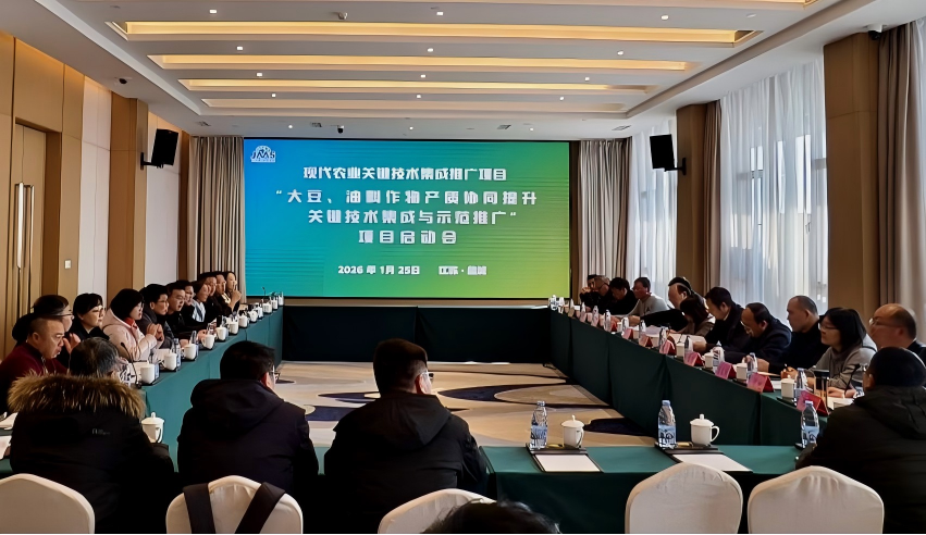 为切实做好江苏省现代农业关键技术集成推广(科技支撑粮油大面积单产提升)项目“大豆、油料作物产质协同提升关键技术集成与示范推广”2026年度的组织实施工作,确保各项任务有序推进、落实到位,2026年1月25日,协作组在江苏东台召开现代农业关键技术集成推广项目启动会。集成项目“大豆、油料作物产质协同提升关键技术集成与示范推广”承担单位江苏省农业科学院、子项目“油料作物机艺融合丰产关键技术集成与示范推广”承担单位江苏省农业科学院经济作物研究所筹备了相关工作。江苏省农业农村厅科教处副处长华棣、江苏省农业科学院成果转化处处长顾军、各项目负责人、项目骨干及单产提升示范县推广部门代表等40余人参加会议。